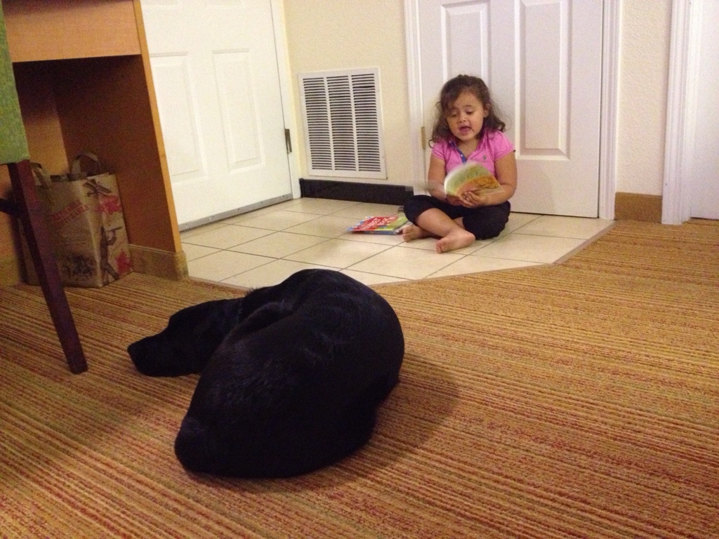 The girl likes books. She can’t read yet but she looks like she can. She just makes makes up stories as she goes. Most of them have me as the main character. Of course.
