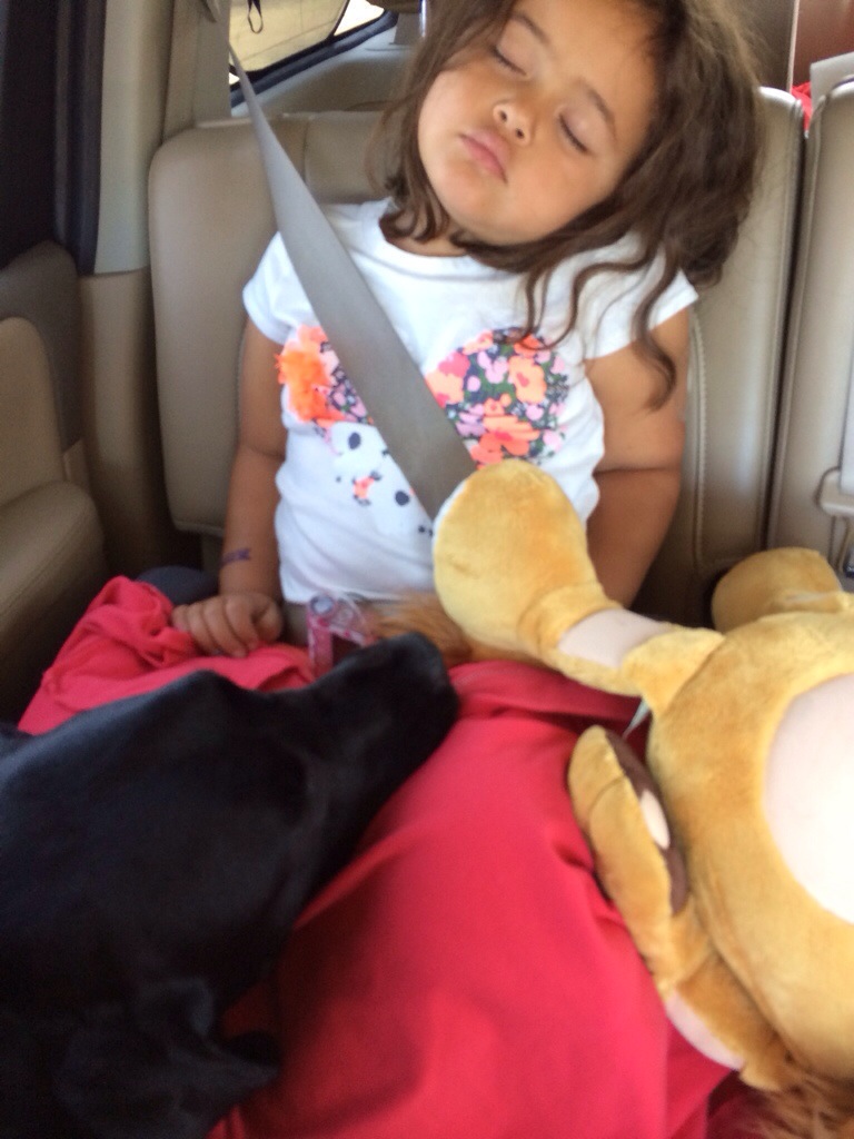 The girl is good at sleeping in the car. I am too. Until I smell there is a problem. Then I get up. I think the mom and the dad are starting to catch on to my game.