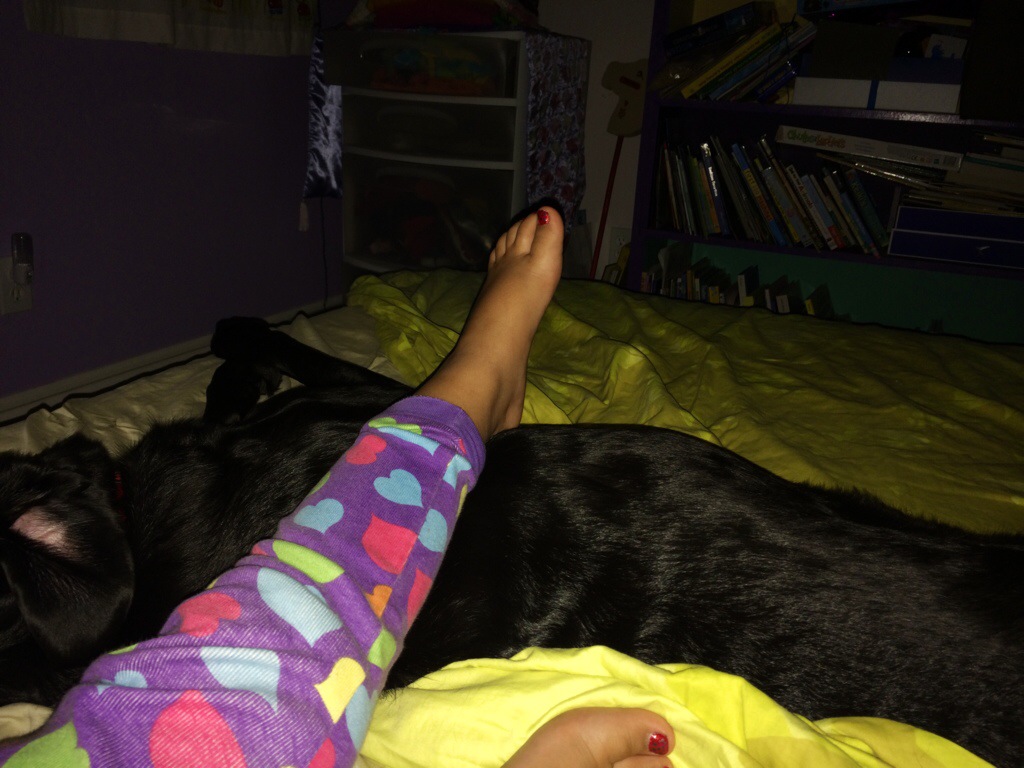 See, I serve another purpose in addition to being the diabetic alert wonder dog. I am a foot rest for the girl as she sleeps. ARGH! The kid moves around so much while she sleeps it’s not even funny. So what do I do? Run away and leave her in her bedroom alone? No, that would be irresponsible. I stay there, so I can keep on the smell-out (get it, look out, smell out) and I put up with the consequences. Including, but not limited to, being used as a foot rest. Such is life here. And it’s a good one.