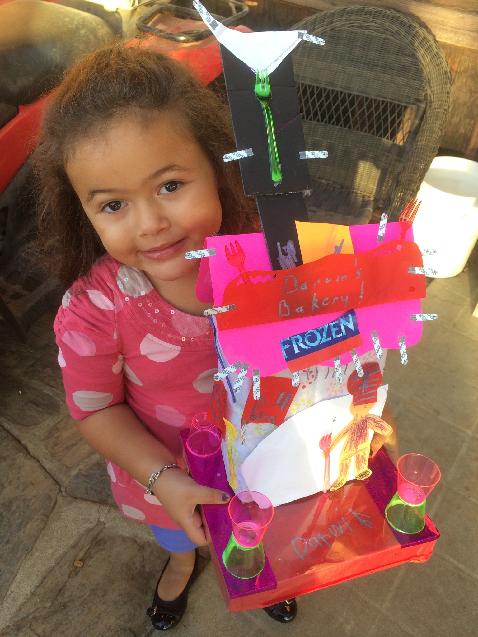 So the girl has a lot of projects for school….now that she’s a big bad kindergartener. One such project was to create a part of the community. She wanted to do a bakery, but not just any bakery. Darwin’s Bakery. Yea, because, a Diabetic Alert Dog, would really want to have a bakery that bakes sweets for people to eat. She’s crazy. But it was a nice gesture I suppose. And on a funny note, she decided to use a lot of used blood glucose testing strips as decorations. They kinda look like icicles I suppose. Yeah, I’m sure that’s what she meant for them to be. It’s a good thing I alert on her so much that she uses so many test strips. Well, by she would have enough test strips to use as shingles for 50 houses I think…..real houses.
